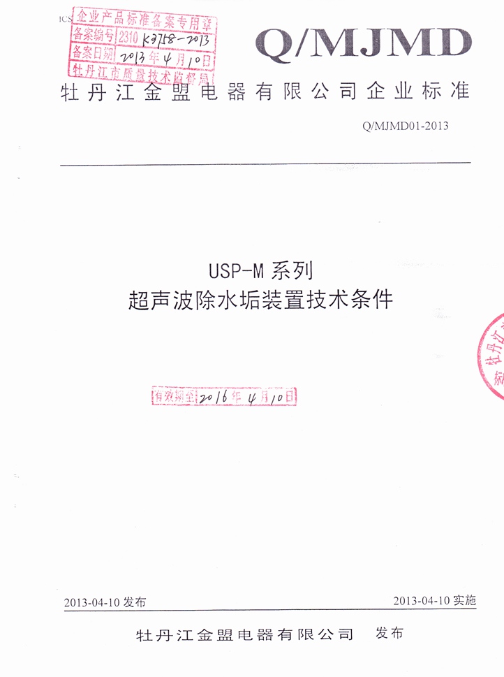 2013年4月10日,牡丹江金盟電器有限公司《USP-M系列超聲波除水垢裝置技術(shù)條件》正式通過技術(shù)監(jiān)督局審核通過,同時發(fā)布并實施。